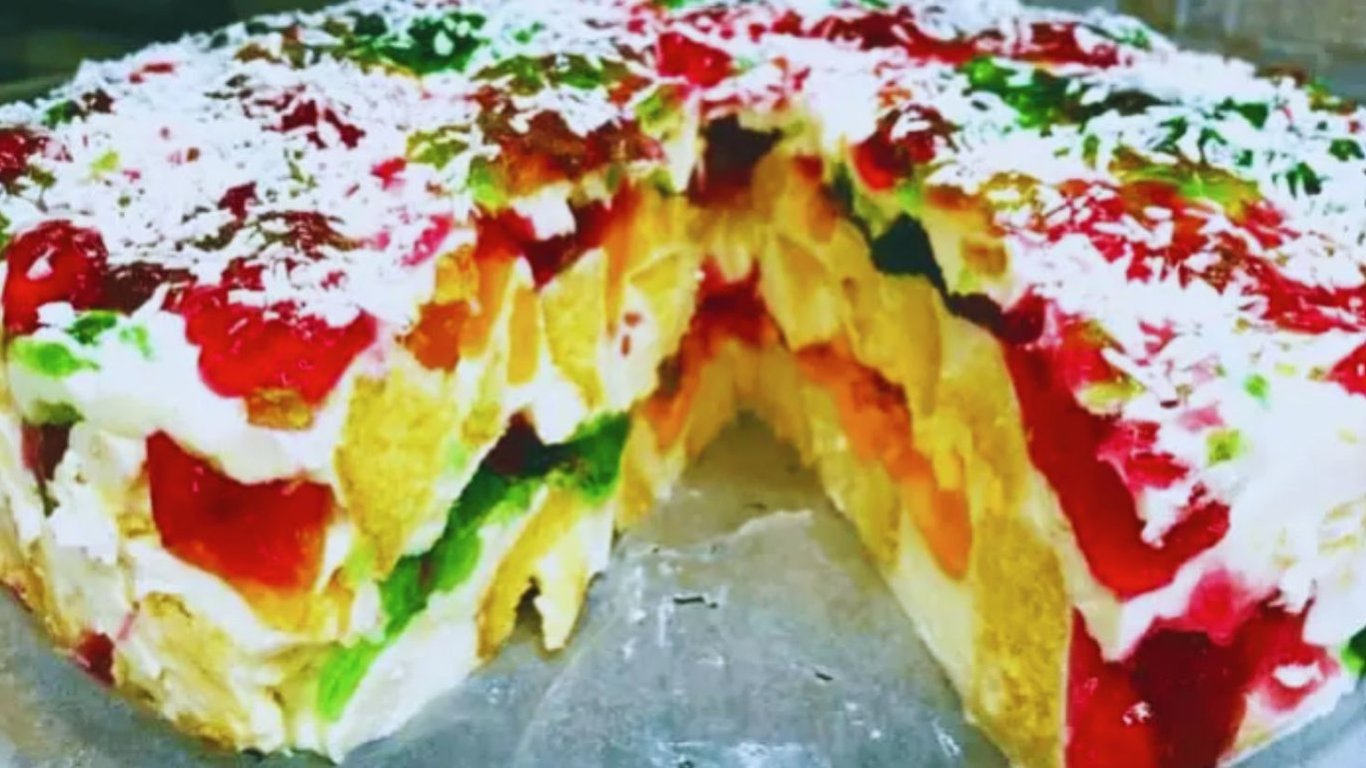 Хаотично нарізати желе виделкою, викласти 1/3 частину кожного кольору. Злегка змастити сирною масою. Викласти другу половину бісквіту, другу частину желе, залити залишками сирної маси. Зверху розподілити останню частину желе, посипати кокосовою стружкою. Поставити торт у холодильник на 3 години. Дістати з форми, подати до столу.