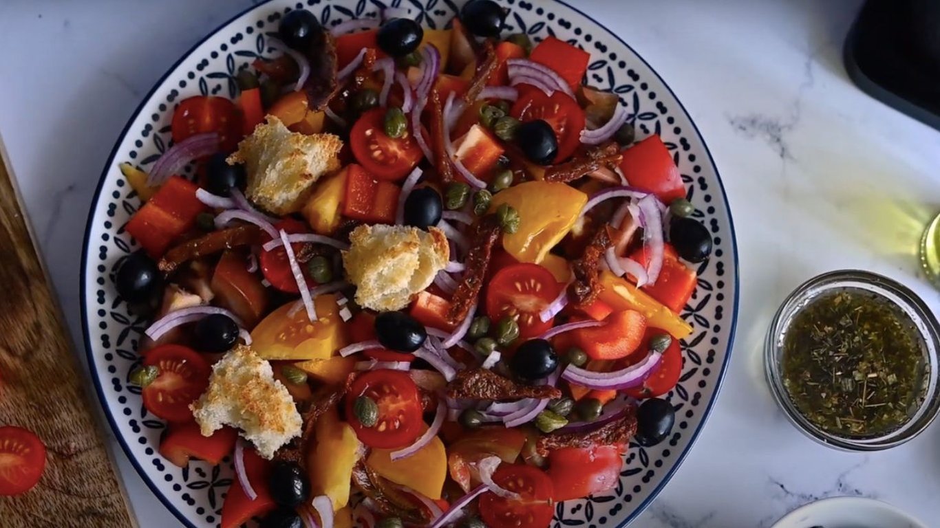 Італійський салат з овочами та хрусткими крутонами — це ідеальне поєднання свіжості та аромату. Легкий та швидкий у приготуванні, він стане чудовим доповненням до будь-якого прийому їжі.