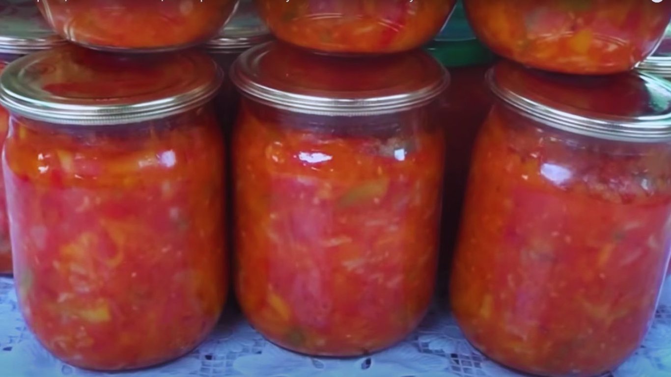 К томатному соусу добавить лук, сладкий перец и морковь. Все перемешать, добавить поллитра растительного масла и довести до кипения. Варить 45 минут, периодически помешивая.