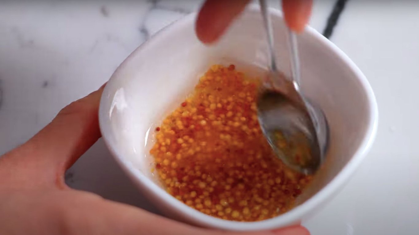 Для заправки смешиваем растительное масло, горчицу в зернах, половину чайной ложки меда и одну чайную ложку уксуса или лимонного сока.