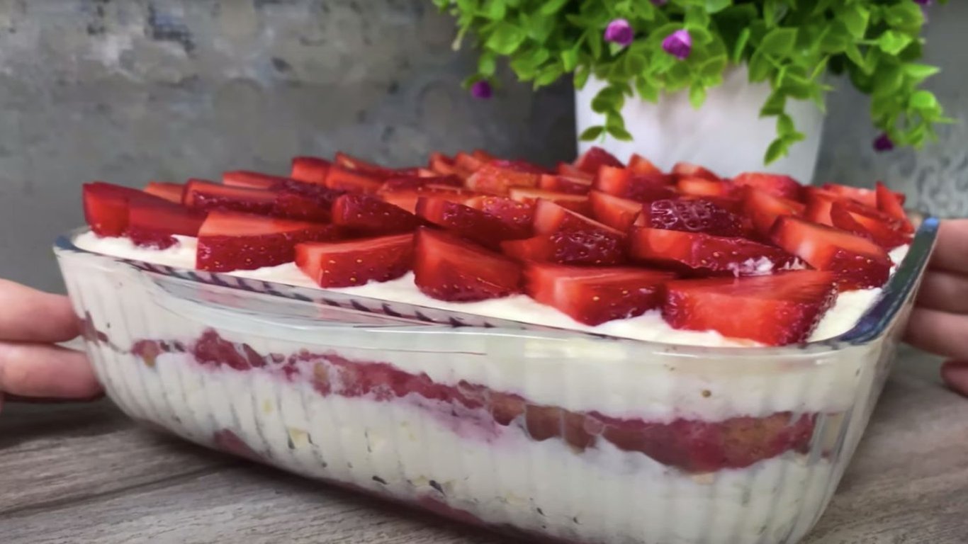 Перший шар печива покрити половиною крему, та викласти другий шар печива, який покрити залишками крему. Накрити полуничний тірамісу харчовою плівкою та поставити у холодильник на 2 години.